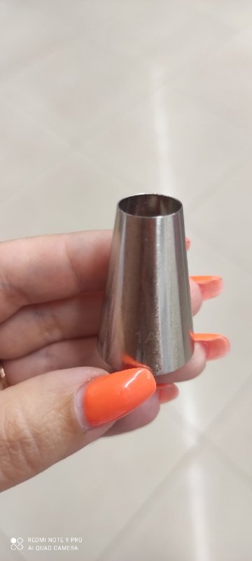 Отличная насадка для маршмеллоу, суфле и крема. Хорошо смотрится крем на тортике "цифра". Но я заметила, что ей не очень удобно отсаживать макарон, так как она слишком широкая, все же для макарон нужно брать насадку меньшим диаметром на выходе.